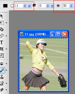 先開啟一張圖片,切到筆刷的選項,調整顏色,大小,透明度及柔邊,因為這會影響到框線的屬性