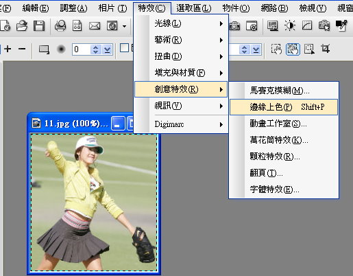 選取整張圖片,選取成功圖片週圍會有淺藍色的虛線,再利用邊緣上色的特效,就可以把剛才設定的筆刷屬性套用到圖片。